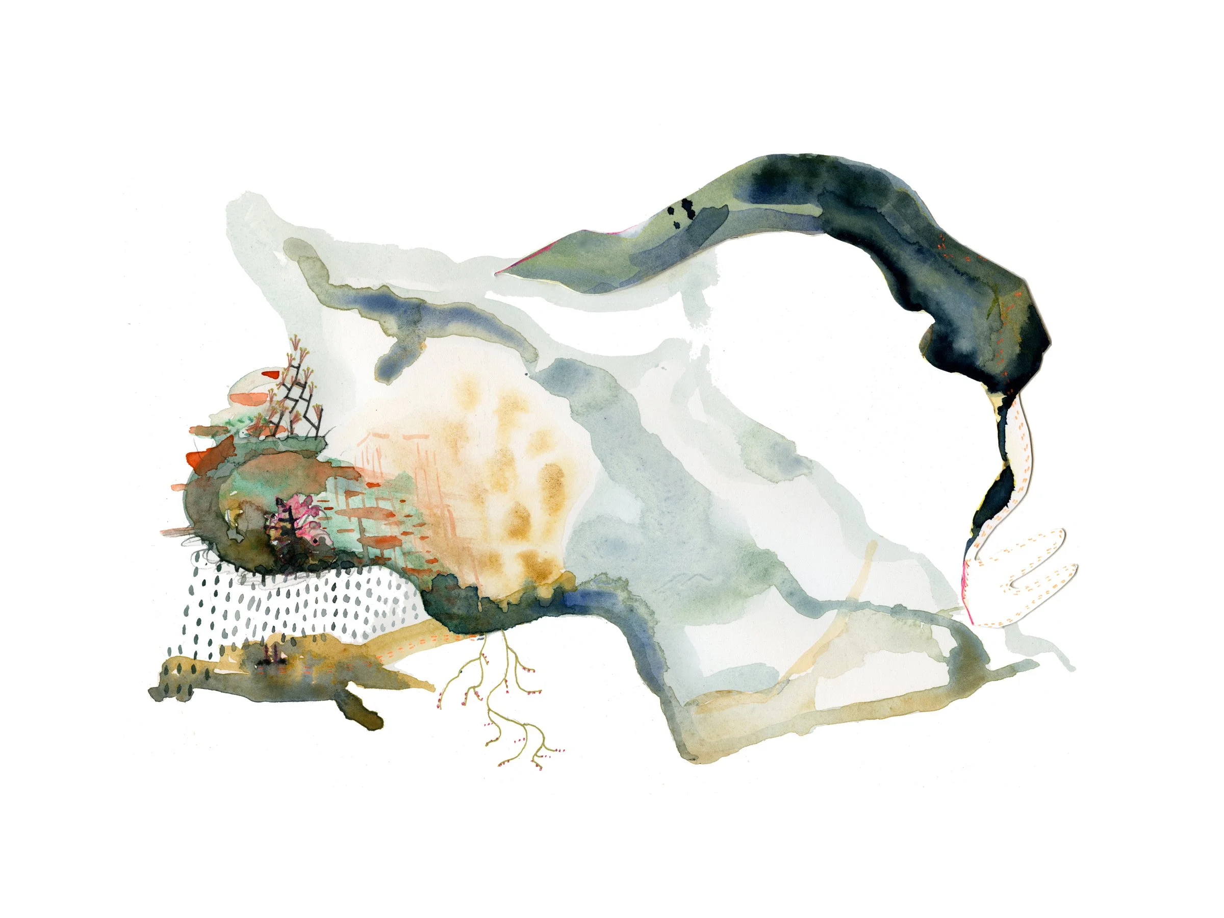 PCT: Spinning About You And You Aren't Even Here, Watercolor, pen, and collage on paper, 9"x12", $400 (unframed). To purchase please contact the artist directly
